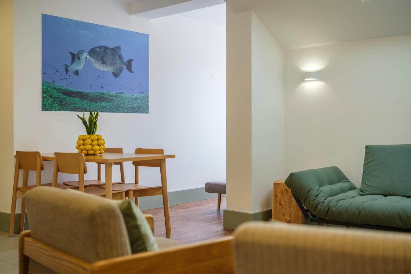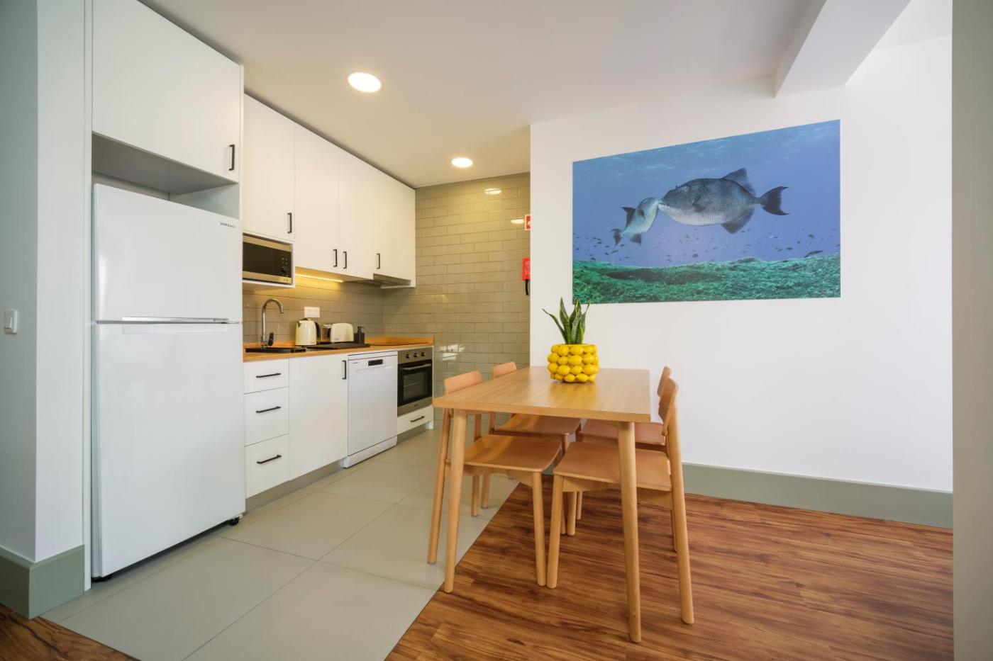 One-Bedroom Apartment. This spacious apartment features 1 living room, 1 separate bedroom and 1 bathroom with a walk-in shower and free toiletries. In the kitchenette, guests will find a stovetop, a refrigerator, a dishwasher and kitchenware. The air-conditioned apartment features a flat-screen TV with satellite channels, a tea and coffee maker, a seating area, a dining area as well as sea views. The unit has 4 beds.