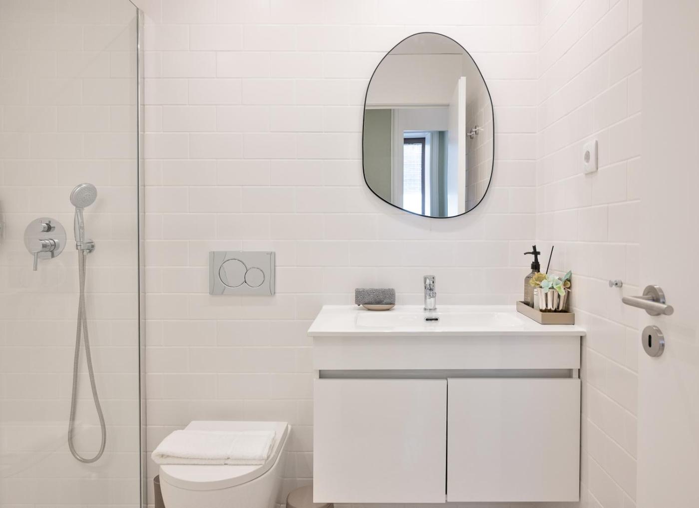 One-Bedroom Apartment. This apartment includes 1 living room, 1 separate bedroom and 1 bathroom with a walk-in shower and free toiletries. The well-equipped kitchen has a stovetop, a refrigerator, a dishwasher and kitchenware. The apartment offers a flat-screen TV with streaming services, a washing machine, soundproof walls, a tea and coffee maker as well as a quiet street view. The unit has 2 beds.